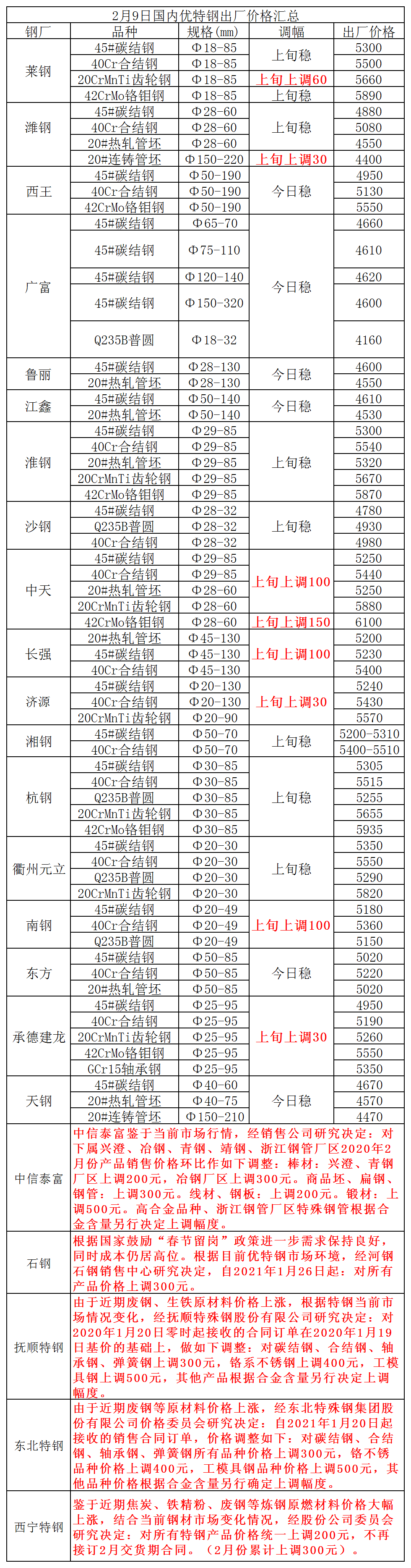 2月9日国内优特钢出厂价格汇总
