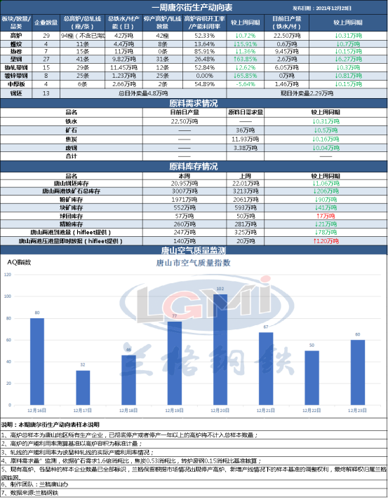 2021年12月23日,兰格发布最新一期《唐尔街生产动向表》。目前唐山地区高炉总体的产能利用率在52.33%,产能利用率较上周有所下降。 本周唐山钢坯市场震荡盘整,目前唐山地区仍处于环保管控状态,停产限运,本地钢坯社会库存水平偏低,如果近期没有重大政策出台,预计短期内市场将维持震荡行情。唐山丰润区三家主要仓库钢坯库存为20.95万吨,较上周同期下降1.06万吨。 本周唐山型材价格弱势盘整,上周在宏观消息利好影响下,型材现货受期货盘面和钢坯走强行情影响,价格上调,涨后资源出货受阻,部分厂家小幅下调试探市场需求,但缘于需求弱势的关键因素影响,成交依然不见起色,目前唐山执行环保限产,资源供应量明显减少。 板材方面,本周唐山地区中板、热卷及带钢均受限产等因素影响,厂家新增订单较少,据反馈目前唐山中厚板企业均未达到满产状态,整体开工率环比上周基本持平,市场供需两弱格局难改。镀锌带钢市场淡季效应明显,加之环保限产政策加严,贸易商信心略显不足,看空后市发展。 唐山两港港口库存总量环比降库206万吨。两港到港量减少,由于唐山临时解除疏港限制,同时个别钢厂存在复产预期,提货积极性增加,故两港口库存有所减量。两港口以球团库存累库为主,粉、块、精粉矿库存均下降。河北地区受限产、限运影响,资源紧张现象凸显,同时由于近期外矿价格偏强,故国内精粉价格整体上涨。但随着冬奥会临近,个别地区矿企生产积极性一般,钢企依旧按需补库。