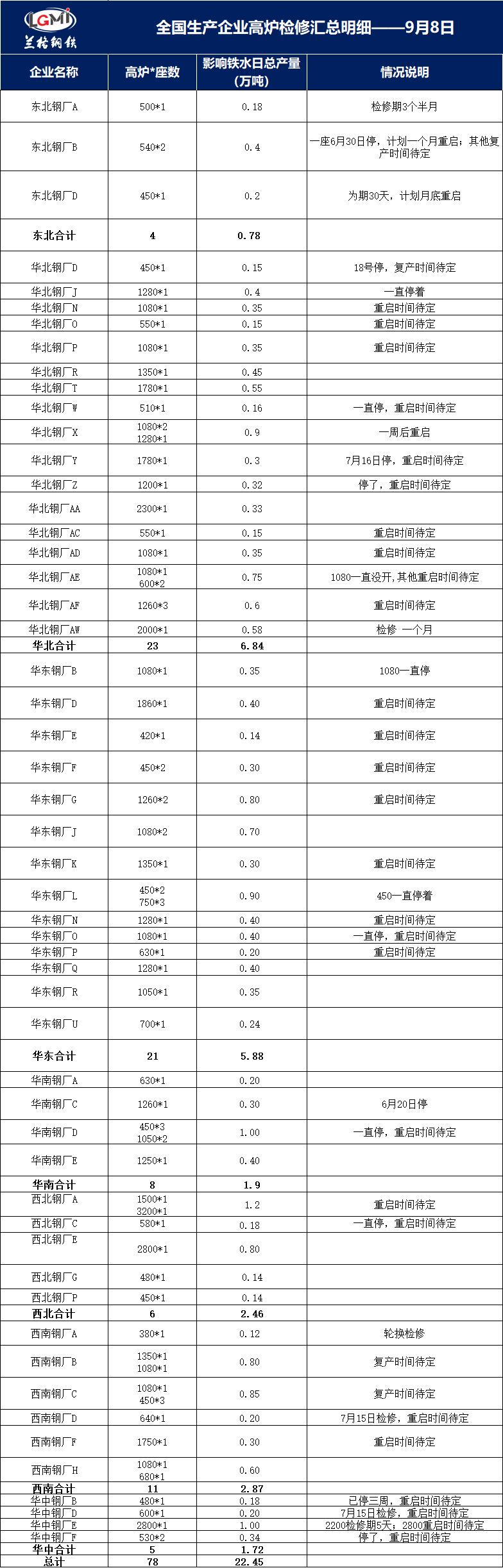 兰格调研:全国生产企业高炉检修汇总明细(9月8日)