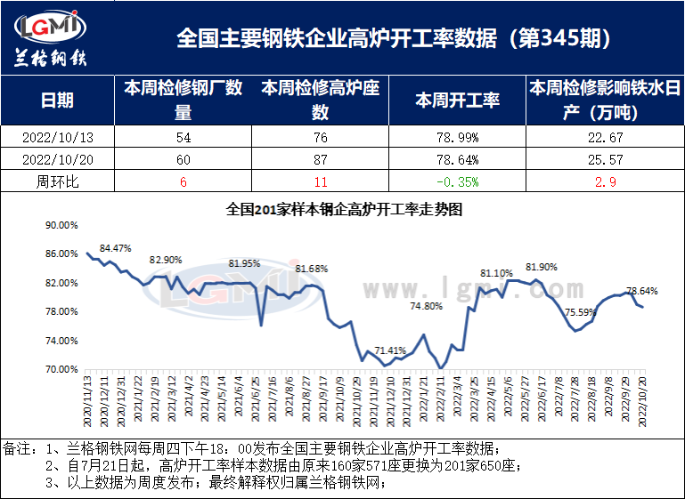 2022年10月20日兰格钢铁网发布(第345期)全国主要钢铁企业高炉开工率数据: 全国201家生产企业中有65家钢厂共计95座高炉停产,其中在检修有60家87座(54家76座),有6家8座高炉不再开启,95座停产高炉总容积为91670立方米,较上周增加4770立方米,按容积计算主要钢铁企业高炉开工率为78.64%,较上周降低0.35%。(注:自2022年7月21日开始,兰格钢铁网对原样本160家571座高炉样本进行更换,新样本为201家650座。) 影响日铁水量为25.52万吨,较上周增加2.9万吨。