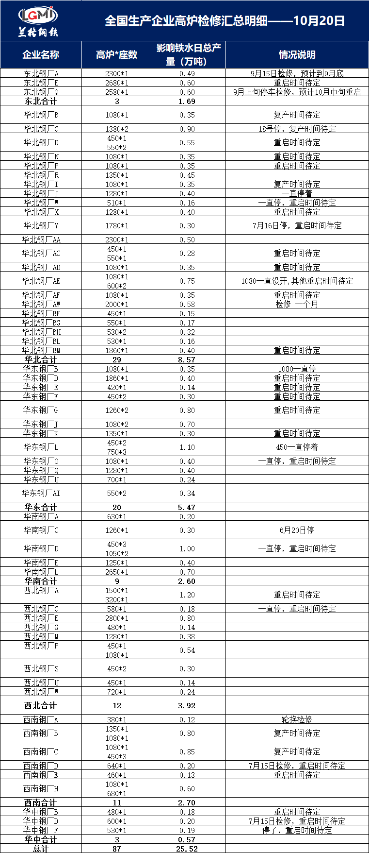 兰格调研:全国生产企业高炉检修汇总明细(10月20日)