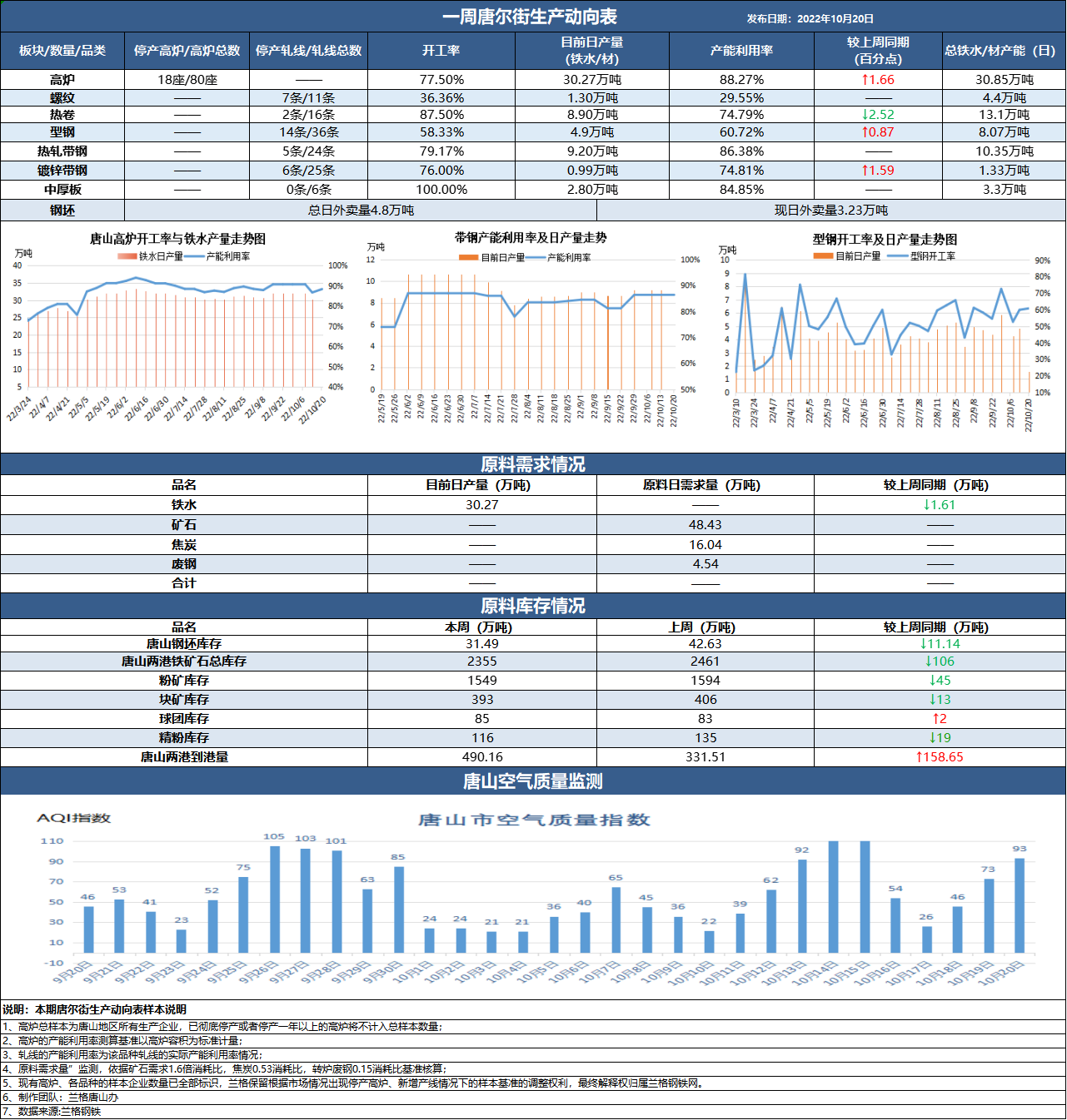 十月份第三周,兰格发布最新一期《唐尔街生产动向表》。唐山环保限产解除,钢厂高炉恢复正常开工。本周新增4座高炉开工,另外一座高炉计划于本周末恢复正常开工,带动高炉开工率以及产能利用率明显上行。但受利润不佳情况影响,部分钢厂高炉铁水产量有所下降。据兰格钢铁网调研数据显示,本周唐山区域高炉产能利用率88.27%,较上周涨1.66个百分点;铁水日产量30.85万吨,较上周增加0.3万吨。 唐山钢坯市场期货延续震荡下行趋势,现货成体成交偏弱,市场情绪低迷,唐山钢坯方面,贸易商期现操作为主,本地终端个别收货,低价资源为主,短期期货与现货价差较大,具备一定吸引力,唐山地区掉坯轧材厂成交偏弱,建议短期观望为主,热卷与螺纹期货套利可继续持有 唐山地区型材现货延续跌势,整体下调区间在20-40元,唐山迁安普碳方坯周同比累跌60报至3590元含税,成材端支撑下移,拖累成材进一步下探,市场拿货意愿不高,叠加期螺盘面弱势调整,各方多持观望情绪谨慎入市,供应方面调查24家独立型材轧钢企业成品材库存约为75.99万吨,成材库存周同比窄幅增加。 板材以及带钢市场弱势下行。热卷以及带钢市场跌势不止。终端需求提升有限,钢厂供应量增加,社会库存高企下,本周市场成交处于下行通道。业者对于后市行情信心不足,入市采购谨慎,贸易商存在主动降库需求。短期来看,需求暂无明显利好,叠加后期美联储加息带来一定扰动,热卷以及带钢市场仍处于偏弱格局。 唐山两港铁矿石港口库存降低。唐山两港铁矿石港口库存合计为2355万吨,较上周减少106万吨。短期来看,终端需求复苏缓慢,国内长流程钢厂利润持续收缩,加上终端需求季节性下滑以及采暖季限产等因素,将影响铁矿石需求存在见顶风险。主流矿山发运整体稳中有增,但非主流矿发运受俄乌冲突以及印度加征关税等因素影响保持相对低迷状态。国产矿受疫情、大会安保、安全事故等影响存在小幅下滑风险,叠加铁矿石港口库存累积速度低于预期且铁水产量下滑主要依赖钢厂主动减产。预计短期铁矿石价格延续下跌走势,中间或现反复行情。