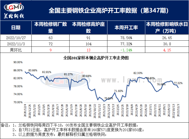 2022年11月3日兰格钢铁网发布(第347期)全国主要钢铁企业高炉开工率数据: 全国201家生产企业中有77家钢厂共计112座高炉停产,其中在检修有72家104座(有63家91座),有6家8座高炉不再开启,99座停产高炉总容积为106000立方米,较上周增加13940立方米,按容积计算主要钢铁企业高炉开工率为77.32%,较上周降低1.24%。(注:自2022年7月21日开始,兰格钢铁网对原样本160家571座高炉样本进行更换,新样本为201家650座。) 影响日铁水量为30.8万吨,较上周增加4.15万吨。