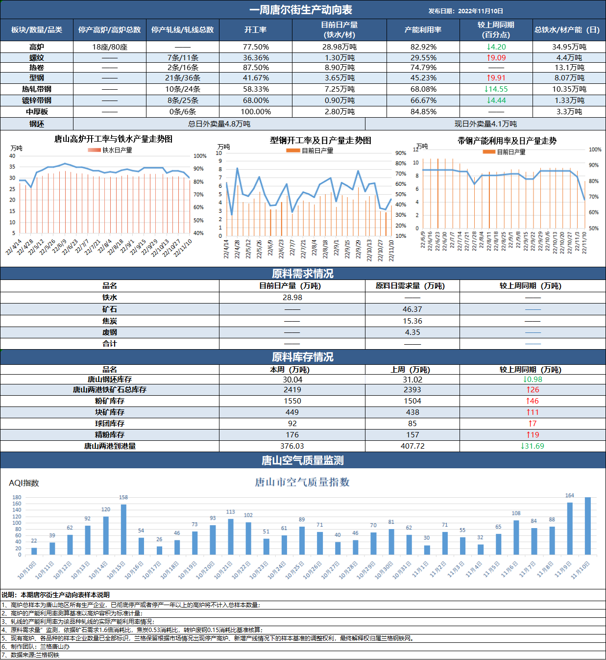 十一月份第二周,兰格发布最新一期《唐尔街生产动向表》。近期成材价格仍处于相对低位,叠加疫情对于需求带来一定扰动,市场整体交投偏弱。受钢厂持续亏损影响,本周唐山区域高炉检修情况增加,另外部分钢厂铁水产量下降。本周唐山区域钢厂新增三座高炉检修,高炉产能利用率承压下行。据兰格钢铁网调研数据显示,本周唐山区域高炉产能利用率82.92%,较上周下降4.20个百分点;铁水日产量28.98万吨,较上周减少1.47万吨。另外,部分钢厂下周仍存检修计划,或带动高炉开工率进一步走低。 本周唐山钢坯市场震荡偏强运行,截至发稿唐山迁安主导钢厂普方坯出厂执行3470元含税,仓储现货主流成交在3530元含税,较上周同期小幅上涨20元左右。供应方面:据兰格钢铁网调研数据显示;本周唐山地区钢坯外卖量在4.1万吨左右(含外省流入资源)较上周同期略有增加,钢厂轧线检修导致钢坯投放量小幅增加。本周唐山地区样本仓库,钢坯社会库存在30.04万吨;外卖量、库存同比均有小幅增量;需求端:本周样本轧钢企业成品材日均出货量在2.73万吨,明显不及上周,轧钢厂普遍亏损开工率维持4成水平,下游情绪向上传导,钢坯现货交投活跃度降低。需求端对于钢坯价格影响力度增强,预计短期钢坯市场震荡偏弱为大概率事件。 本周唐山地区型材价格窄幅上行,上涨区间在20-40元。本周成材市场表现为先强后弱,受上周五期螺夜盘以及普方坯上扬带动,型材资源坚挺上探;但后期随着期货盘面弱势回调,各方谨慎情绪增加,加之需求释放力度不足,市场价格止涨下行。综合来看,周内需求表现平平。供应方面调查24家独立型材轧钢企业成品材库存约为63.15万吨,有明显降库迹象。主要原因在于:一是唐山部分区域因疫情处于临时管控状态,个别厂家受疫情影响开工受限;二是部分厂家自主停产消库意愿较浓,市场供应量总体表现下降。 板材以及带钢市场温和上涨。热卷现货市场跟随期货盘面小幅上涨,但涨势相对有限,下游业者对于后市信心不足入市采购多按需为主,市场成交仍偏向于谨慎。带钢市场价格震荡上行,市场交投表现一般。据兰格钢铁网调研数据显示,本周带钢开工率较上周呈现下降趋势,截至目前唐山355带钢市场价格在3700元左右。 唐山两港铁矿石港口库存缓慢累库。本周唐山两港铁矿石港口库存合计为2419万吨,较上周增加26万吨。供应方面,全球铁矿石发运量回升至中位偏高水平,但到港量中位偏低,供应端整体变动不大;需求方面,铁水下降速率缓慢,但预计后期存加速预期,整体来看港口库存趋于累积的趋势较为明确。
