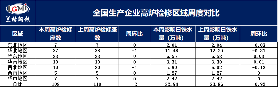 据兰格调研:201家样本高炉企业中,有108座高炉检修,影响日铁水量32.94万吨,较上周减少0.92万吨。其中:东北地区有7座高炉检修,影响日铁水量2.01万吨,较上周减少0.03万吨;华北地区37座高炉检修,影响日铁水量11.48万吨,较上周减少0.81万吨;华东地区23座高炉检修,影响日铁水量6.55万吨,较上周增加0.03万吨;华南地区10座高炉检修,影响日铁水量3.31万吨,较上周增加0.01万吨;西北地区19座高炉检修,影响日铁水量5.9万吨,较上周减少0.12万吨;西南地区5座高炉检修,影响日铁水量1.27万吨,较上周持平;华中地区7座高炉检修,影响日铁水量2.42万吨,较上周持平。