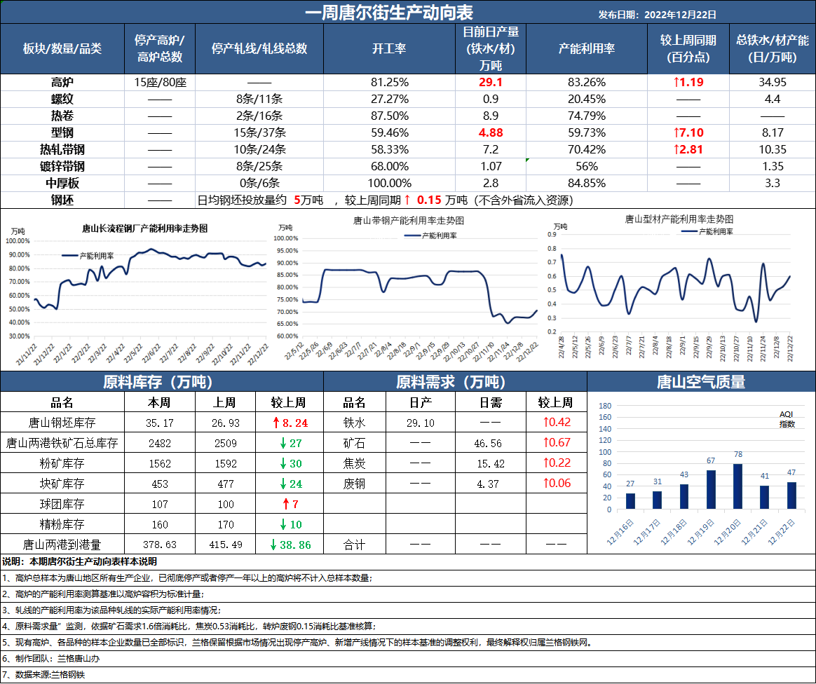 十二月第三周,兰格发布最新一期《唐尔街生产动向表》。本周唐山地区成品材价格窄幅波动,钢坯延续亏损,长流程钢厂成品材部分品种毛利转正,调坯厂当期利润表现依旧偏差。据兰格钢铁网调研数据显示:唐山地区样本长流程钢厂,铁水累计成本不含税均值为3025元;钢坯含税累计成本(不含三费)均值为3849元,按照目前迁安地区主导钢厂普碳方坯出厂执行3730元的价格来算,钢坯利润为-119元。截止目前,唐山区域样本长流程钢厂高炉产能利用率83.26%,周环比增加1.19个百分点;样本长流程钢厂铁水日产量约29.1万吨,周环比增加约0.42万吨。 本周唐山两港铁矿石港口库存合计为2482万吨,较上周减少27万吨。周内黑色系先扬后抑,现实层面全国各地区感染陆续进入高峰期,生产生活停滞,叠加即将迎来传统春节假期,影响终端需求复苏,短期来看强预期或存降可能。 本周唐山钢坯价格窄幅震荡,截至发稿迁安主导钢厂普方坯出厂执行3730元含税,较上周同期降80元,市场交投节奏放缓。周内样本仓库钢坯库存35.17万吨,周环比增加8.24万吨。据兰格钢铁网调研数据显示:本周唐山地区日均钢坯外卖量约5万吨(含外省流入资源),较上周同期略有减少,整体处于中等偏多水平。截至目前周内样本轧钢企业成材日均出货量约4.74万吨,较上周均值增加0.87万吨。周内唐山样本轧钢企业厂内成品库存仍呈现高位,在市场情绪、供需基本面的共同作用下,周内钢坯市场整体波动不大。 本周唐山型材市场震荡下跌,跌幅在60-130元,受上周五期盘回落拖累,成材连连下挫,在行情震荡回调阶段,下游市场购销谨慎愿。周前期各厂维持弱势交投,周中伴随盘面止跌回涨,市场存探涨情绪,在此带动下,积攒的刚性需求得以宽幅释放,周内综合唐山24家型材厂整体成交量接近19万吨。供应端样本轧钢企业共37条轧线,开工率为59.46%,周环比上升8.11个百分点;轧钢厂成品材库存约为72.53万吨,累库态势未改。 卷带价格较上周窄幅回落。受需求弱势以及疫情阳性病例增多情况影响,市场交投整体维持不温不火,下游业者入市适度采购。虽接近年底,但受制于市场价格高位影响,贸易商冬储意愿不足。本周唐山地区带钢市场价格震荡下挫,截至目前唐山355带钢市场价格在4000元左右,较上周同期价格下降了百元左右。 |