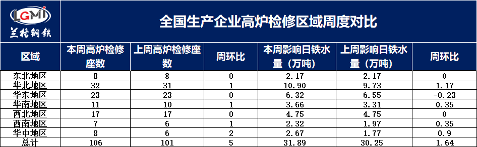 据兰格调研:201家样本高炉企业中,有106座高炉检修,影响日铁水量31.89万吨,较上周增加1.64万吨。其中:东北地区有8座高炉检修,影响日铁水量2.17万吨,较上周持平;华北地区32座高炉检修,影响日铁水量10.9万吨,较上周增加1.17万吨;华东地区23座高炉检修,影响日铁水量6.32万吨,较上周减少0.23万吨;华南地区11座高炉检修,影响日铁水量3.66万吨,较上周增加0.35万吨;西北地区17座高炉检修,影响日铁水量4.75万吨,较上周持平;西南地区7座高炉检修,影响日铁水量2.32万吨,较上周增加0.35万吨;华中地区8座高炉检修,影响日铁水量2.67万吨,较上周增加0.9万吨。