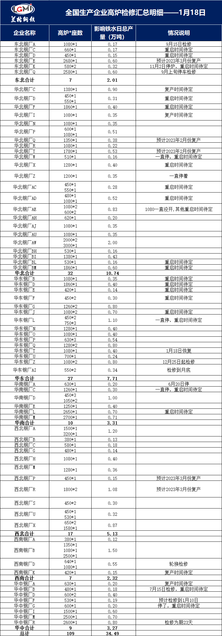 兰格调研:全国生产企业高炉检修汇总明细(1月18日)