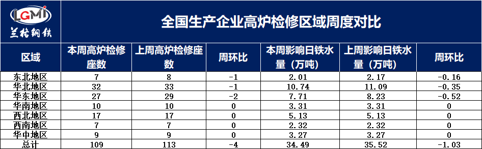 据兰格调研:201家样本高炉企业中,有109座高炉检修,影响日铁水量34.49万吨,较上周减少1.03万吨。其中:东北地区有7座高炉检修,影响日铁水量2.01万吨,较上周减少0.16万吨;华北地区32座高炉检修,影响日铁水量10.74万吨,较上周减少0.35万吨;华东地区27座高炉检修,影响日铁水量7.71万吨,较上周减少0.52万吨;华南地区10座高炉检修,影响日铁水量3.31万吨,较上周持平;西北地区17座高炉检修,影响日铁水量5.13万吨,较上周持平;西南地区7座高炉检修,影响日铁水量2.32万吨,较上周持平;华中地区9座高炉检修,影响日铁水量3.27万吨,较上周持平。