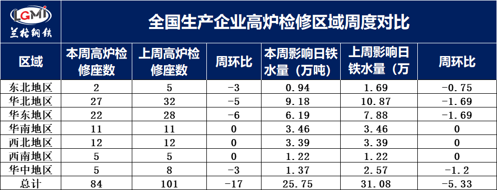 据兰格调研:201家样本高炉企业中,有84座高炉检修,影响日铁水量25.75万吨,较上周减少5.33万吨。其中:东北地区有2座高炉检修,影响日铁水量0.94万吨,较上周减少0.75万吨;华北地区27座高炉检修,影响日铁水9.18万吨,较上周减少1.69万吨;华东地区22座高炉检修,影响日铁水量6.19万吨,较上周减少1.69万吨;华南地区11座高炉检修,影响日铁水量3.46万吨,较上周持平;西北地区12座高炉检修,影响日铁水量3.39万吨,较上周持平;西南地区5座高炉检修,影响日铁水量1.22万吨,较上周持平;华中地区5座高炉检修,影响日铁水量1.37万吨,较上周减少1.2万吨。