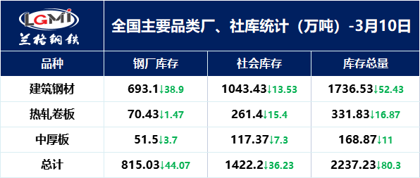 3月10日,兰格云商平台监测全国主要品类厂、社库统计显示,本周总库存量为2237.23万吨,较上周下降80.3万吨。其中:建筑钢材库存总量为1736.53万吨,较上周下降52.43万吨;热轧卷板库存总量为331.83万吨,较上周下降16.87万吨;中厚板库存总量为168.87万吨,较上周下降11万吨。