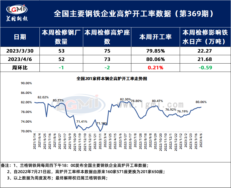 2023年4月6日兰格钢铁网发布(第369期)全国主要钢铁企业高炉开工率数据: