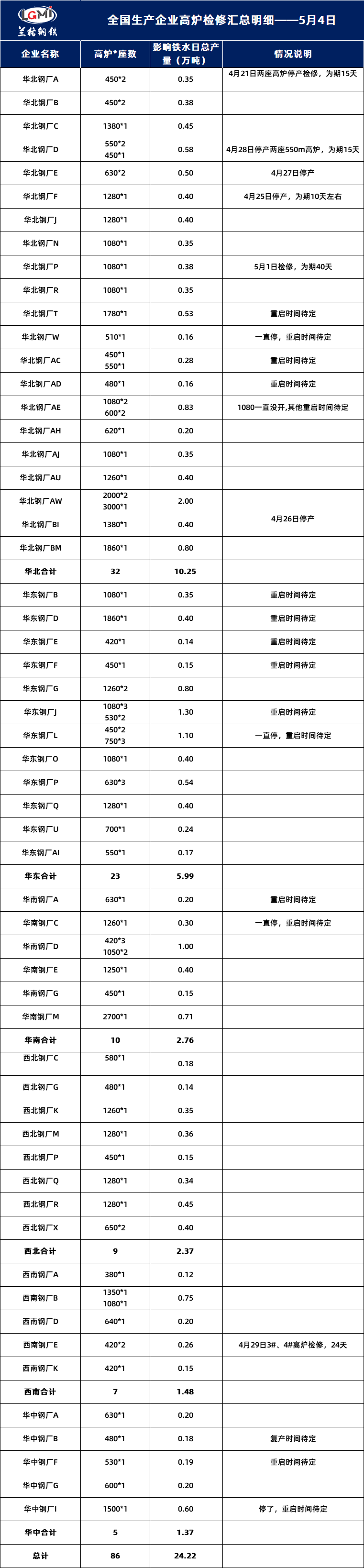 兰格调研:全国生产企业高炉检修汇总明细(5月4日)
