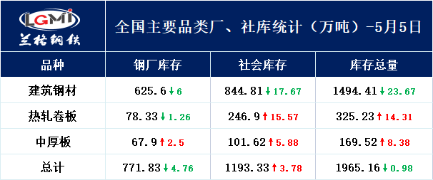 5月5日,兰格云商平台监测全国主要品类厂、社库统计显示,本周总库存量为1965.16万吨,较上周降0.98万吨。其中:建筑钢材库存总量为1470.41万吨,较上周下降23.67万吨;热轧卷板库存总量为325.23万吨,较上周增加14.31万吨;中厚板库存总量为169.52万吨,较上周增加8.38万吨。