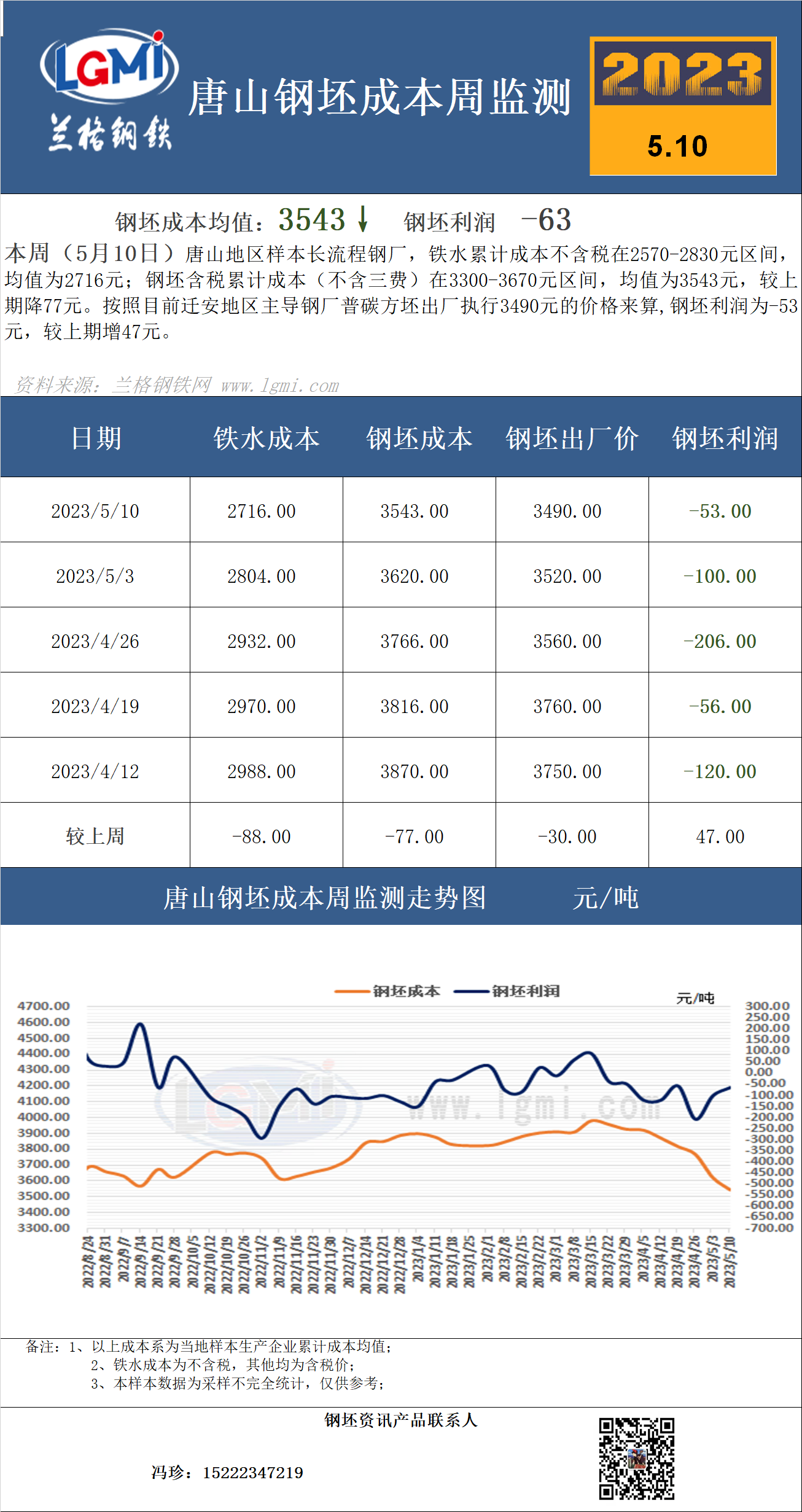 兰格调研:唐山钢坯成本周监测(5月10日)