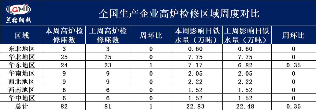 据兰格调研:201家样本高炉企业中,有82高炉检修,影响日铁水量22.83万吨,较上周增加0.35万吨。其中:东北地区3座高炉检修,影响日铁水0.6万吨,较上周持平;华北地区25座高炉检修,影响日铁水7.75万吨,较上周持平;华东地区24座高炉检修,影响日铁水量7.17万吨,较上周增加0.35万吨;华南地区9座高炉检修,影响日铁水量2.05万吨,较上周持平;西北地区9座高炉检修,影响日铁水量2.22万吨,较上周持平;西南地区6座高炉检修,影响日铁水量1.52万吨,较上周持平;华中地区6座高炉检修,影响日铁水量1.52万吨,较上周持平。