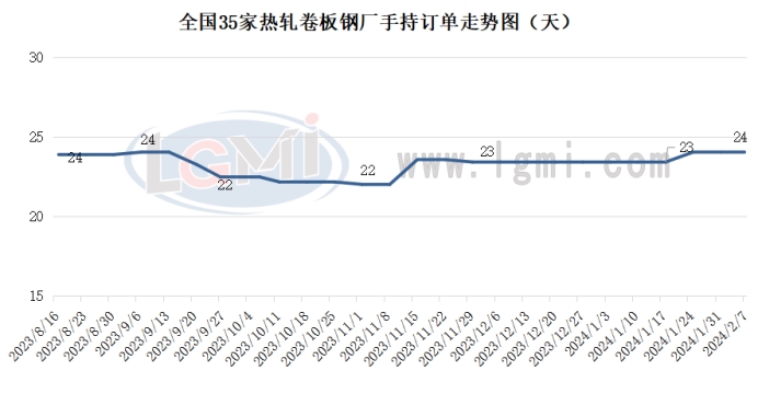 国内热卷生产企业手持订单天数均值为24天,较上周增加1天。具体来看,一线企业手持订单天数保持在30天,二线企业基本保持在10-20天左右。