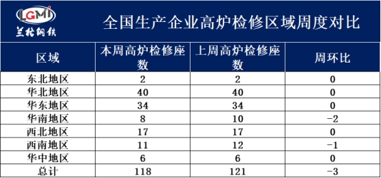 二、全国生产企业高炉检修区域对比 据兰格调研:201家样本高炉企业中,有118座高炉检修,较上周减少3座。其中:华南地区8座高炉检修,较上周减少2座;西南地区11座高炉检修,较上周减少1座;东北地区2座高炉检修、华北地区40座高炉检修、华东地区34座高炉检修、西北地区17座高炉检修、华中地区6座高炉检修,周环比均持平。
