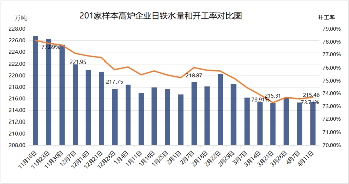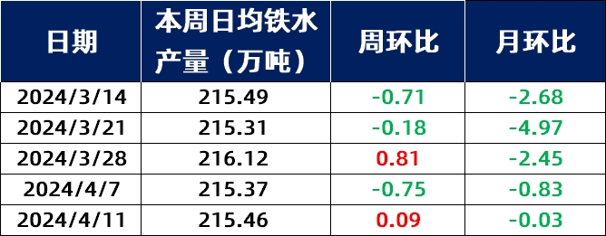 2024年4月11日,据兰格调研,全国201家生产企业铁水日均产量为215.46万吨,周环比增加0.09万吨,总体月环比减少0.03万吨;2月份日均铁水产量均值为218.53万吨,3月日均铁水产量为215.78万吨,4月日均铁水产量为215.42万吨,从数据来看,目前全国钢企铁水日产量少量增加,因个别高炉重启,铁水日产量小幅上升。 本周钢厂日铁水产量较上周有所减少,其中华北个别高炉重启,铁水产量小幅增加;华中地区部分钢企铁水产量微调,稍有减少;其他区域日铁水产量基本保持平稳。 近期期货盘面走势震荡,螺纹和热卷价格变化幅度较小,中厚板价格小幅盘整,钢厂利润变化不大,除个别高炉检修结束外,目前铁水量无增减计划。近期终端需求仍表现一般,各品种需求量无明显好转,好在板材社库稍有减少,部分业者心态稍有改善,交易情绪有所提升。