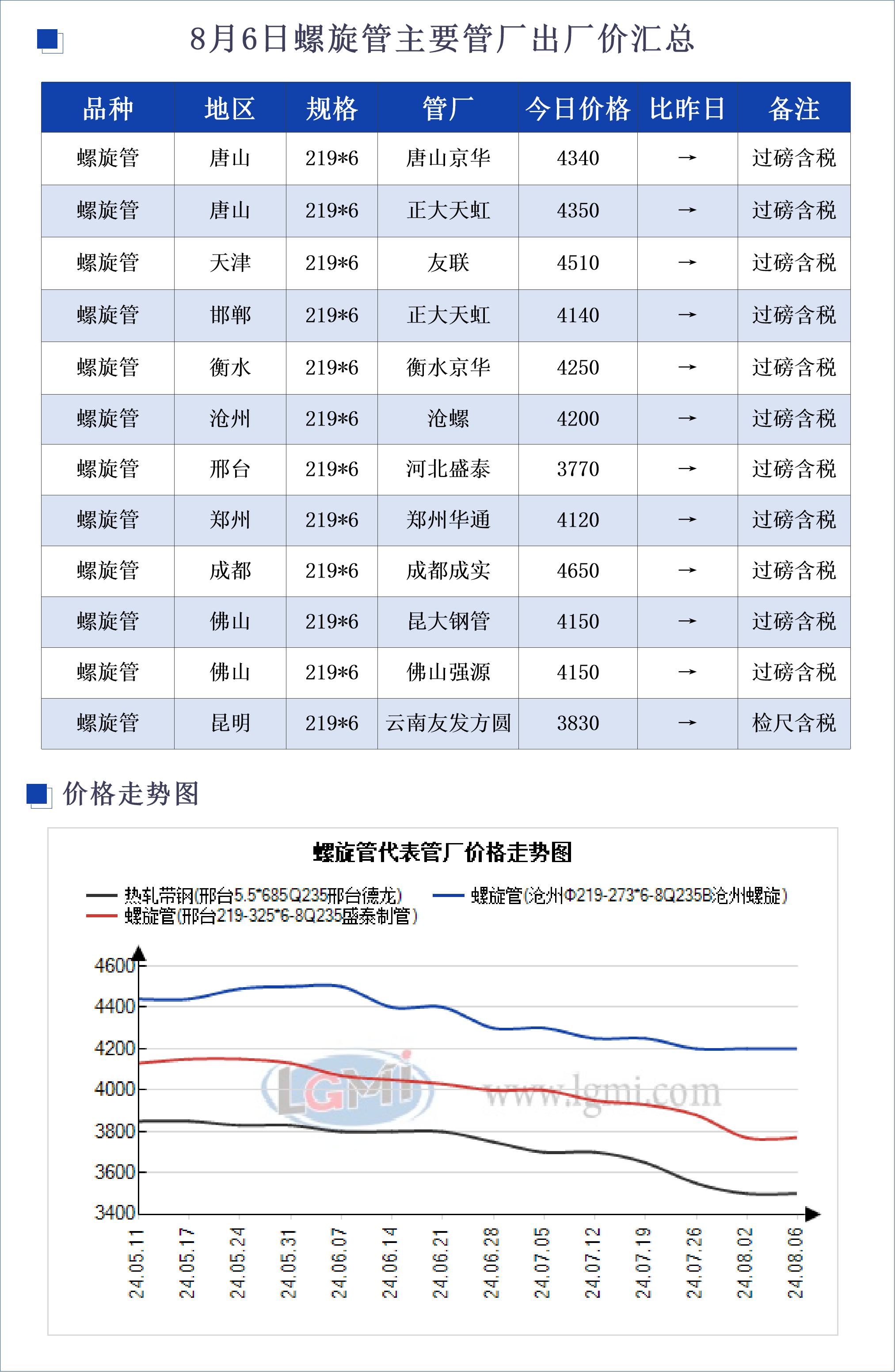 • 8月6日螺旋管主要管厂出厂价汇总