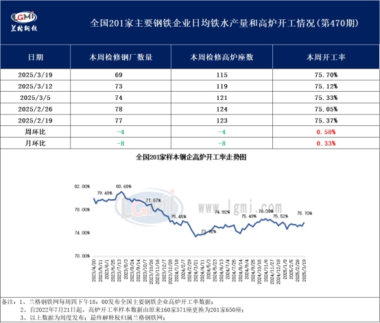 一、全国201家生产企业高炉开工周度数据上升 据兰格钢铁网监测数据显示,2025年3月19日全国201家生产企业中有69家钢厂共计115座高炉检修停产,总容积为123820立方米,较上周减少6194立方米,按容积计算主要钢铁企业高炉开工率为75.70%,较上周上升0.58%。 本周新增恢复生产的高炉数量较多,据最新调研数据显示,全国钢厂日铁水总产量较上周增加,增量主要集中华北、西北及华中区域,主要增量原因是部分前期检修高炉恢复生产导致铁水增量,而其他区域铁水量暂无明显变动。