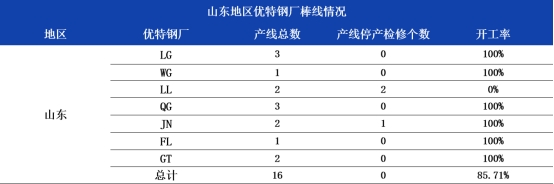 山东地区7家钢厂总棒线15条,开工13条,整体开工率85.71%,周环比持平。本周除鲁丽停产其余钢厂均正常生产中。