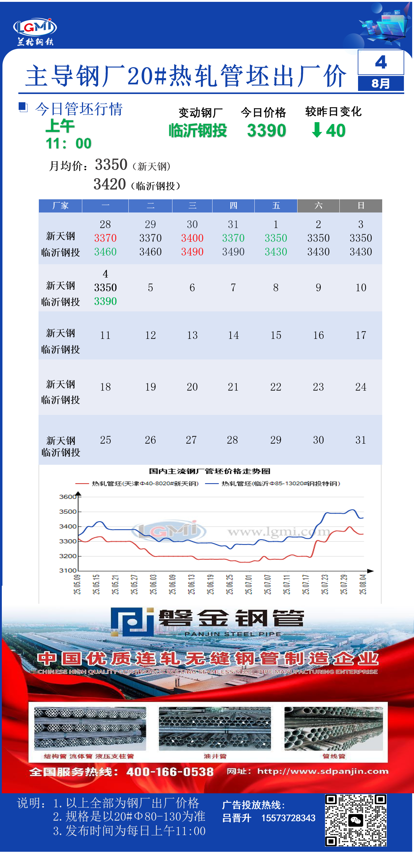 • 8月4日(11:00)主导钢厂20#热轧管坯出厂价