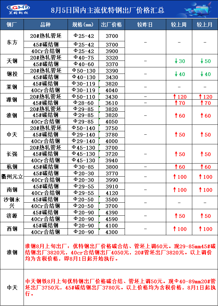 • 8月5日国内主流优特钢出厂价格汇总