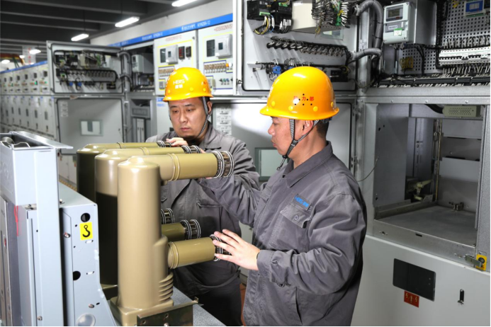 7月31日,河钢集团唐钢公司动力部青工正在检查高压开关柜触头。