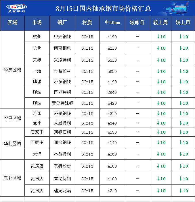 • 8月15日国内轴承钢市场价格汇总