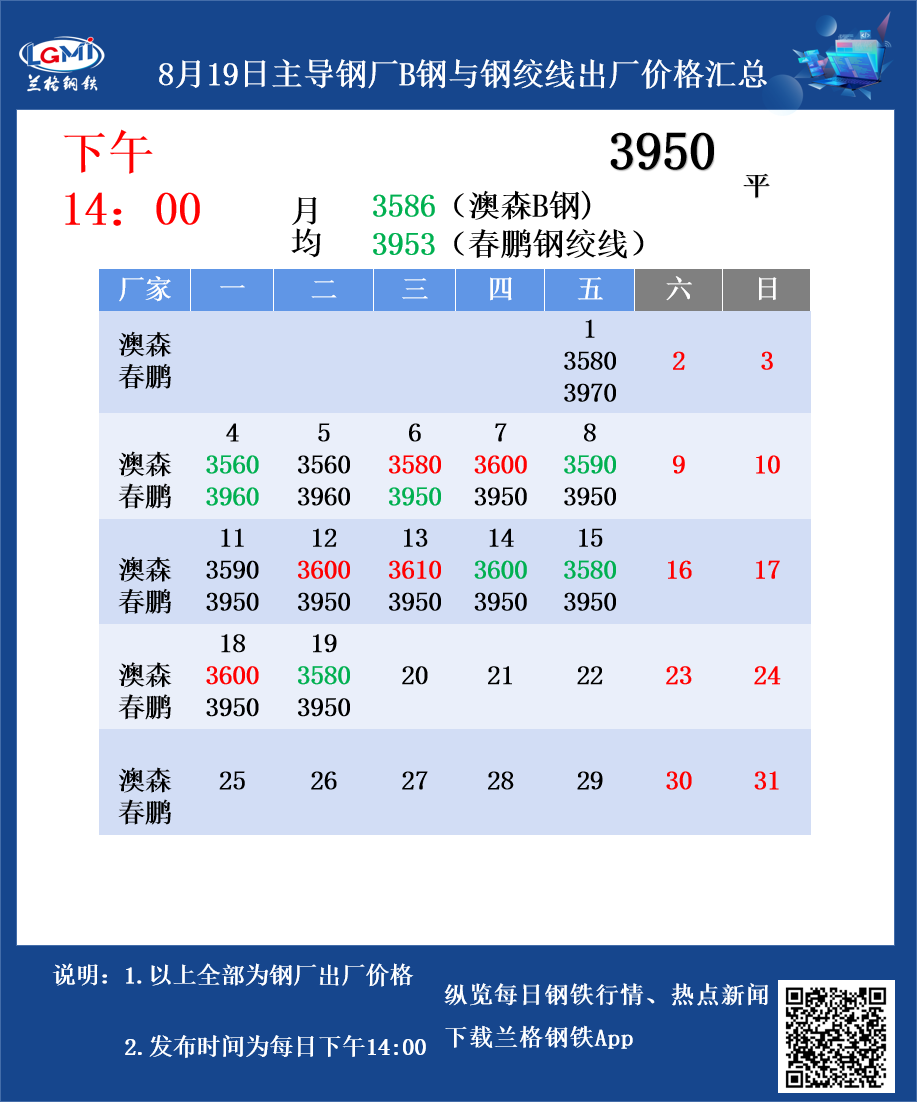 • 8月19日主导钢厂B钢与钢绞线出厂价格