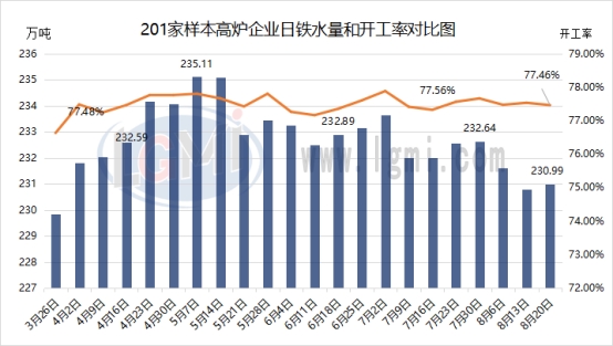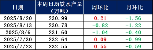 2025年8月20日,据兰格调研,全国201家生产企业铁水日均产量为230.99万吨,周环比增加0.21万吨,总体月环比减少1.56万吨;25年6月日均铁水产量为232.95万吨,7月日均铁水产量为232.56万吨,8月日均铁水产量为231.12万吨。