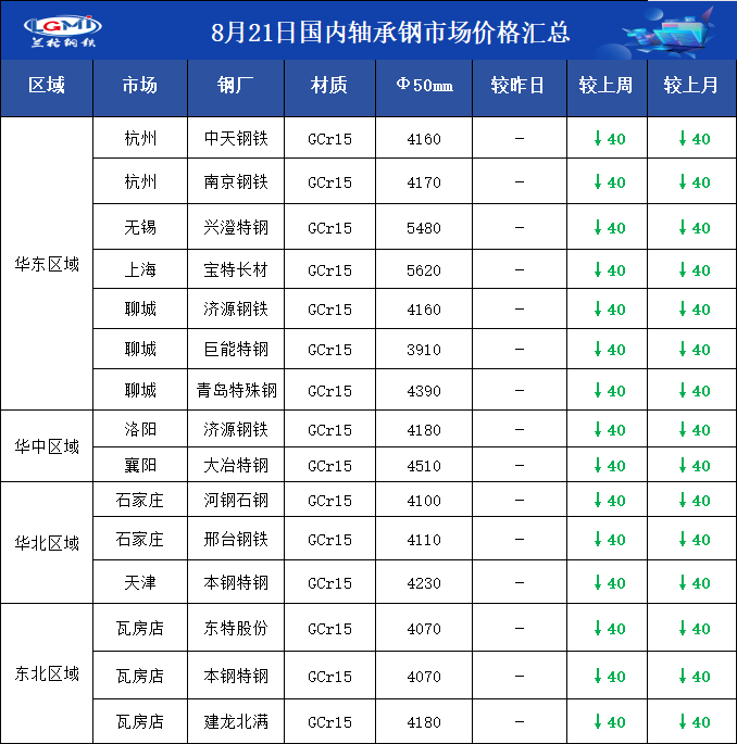 • 8月21日国内轴承钢市场价格汇总