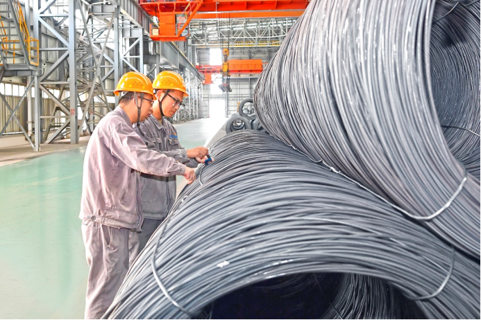 8月13日,河钢集团唐钢公司长材事业部职工正在库区检查控冷工艺优化后的焊丝钢尺寸精度。