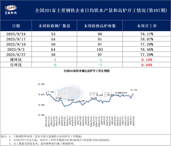 一、全国201家生产企业高炉开工周度数据小幅上升 据兰格钢铁网监测数据显示,2025年9月24日全国201家生产企业中有53家钢厂共计90座高炉检修停产,总容积为96860立方米,较上周减少1080立方米,按容积计算主要钢铁企业高炉开工率为78.17%,较上周上升0.1%。 本周铁水总量较上周小幅增加,主要增量集中在华北、西北及华中区域,域内共计2座前期检修停产焖炉高炉恢复生产及3家企业高炉增产;而华东区域1家企业高炉铁水产量减少,使得域内铁水总量较上周减少;其他区域铁水总量则较上周暂无变动。