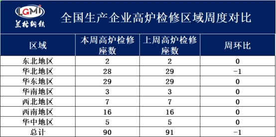 二、全国生产企业高炉检修区域对比 据兰格调研:201家样本高炉企业中,有90座高炉检修,较上周减少1座。其中:东北地区2座高炉检修,较上周持平;华北地区28座高炉检修,较上周减少1座;华东地区29座高炉检修,较上周持平;华南地区3座高炉检修,较上周持平;西北地区7座高炉检修,较上周持平;西南地区16座高炉检修,较上周持平;华中地区5座高炉检修,较上周持平。