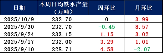2025年10月9日,据兰格调研,全国201家生产企业铁水日均产量为232.7万吨,较节前持平,总体月环比增加3.99万吨;25年8月日均铁水产量为230.88万吨,9月日均铁水产量为230.14万吨,10月日均铁水产量为232.7万吨。本周铁水总量较节前持平,国庆小长假期间生产企业暂无新增检修减产情况。