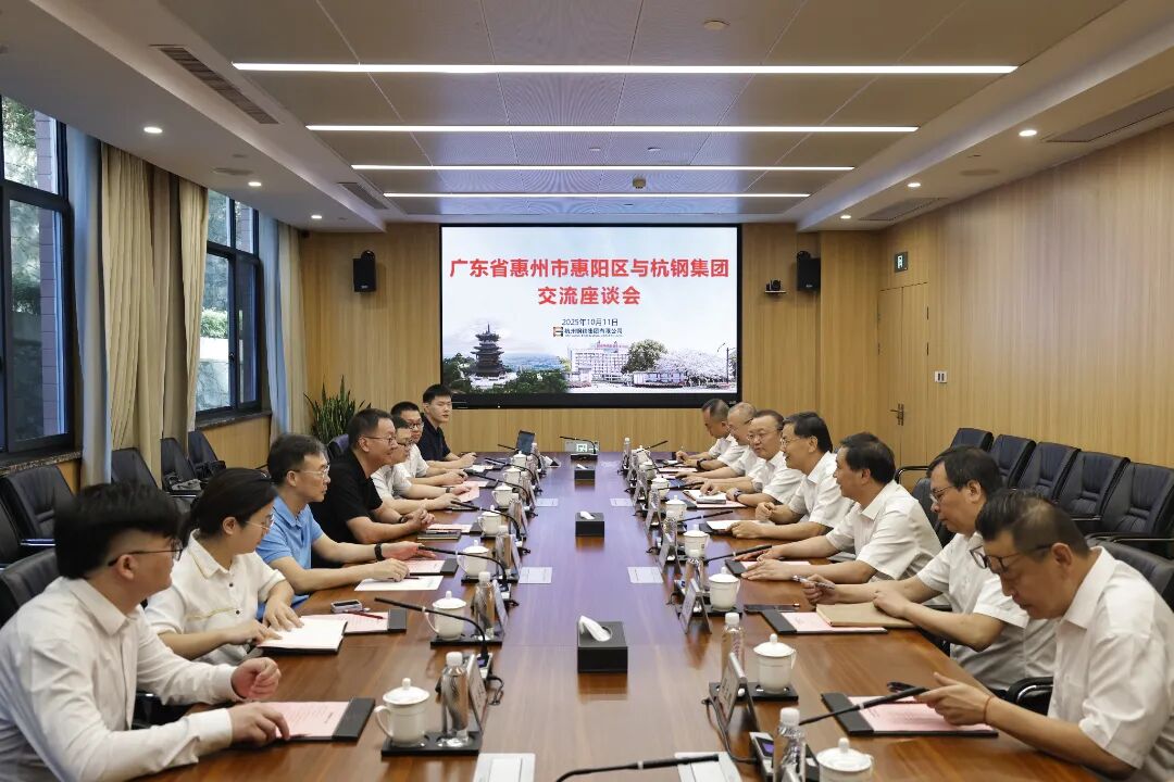 10月11日,广东省惠州市惠阳区委书记谭星海一行到杭钢集团交流座谈,杭钢集团党委书记、董事长章建成热情接待。杭钢集团党委委员、副总经理刘树林,双方相关单位(部门)负责人参加。