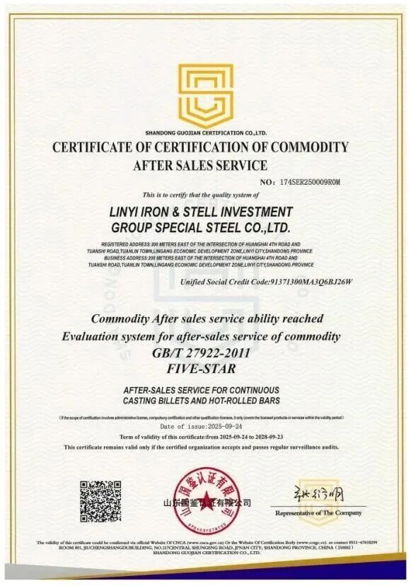 近日,特钢公司在售后服务领域获得权威认可,成功通过“连铸钢坯和热轧棒材售后服务”五星级认证。该认证基于服务体系完整性、响应效率、问题解决能力、客户反馈及持续改进等多维度综合评定,是衡量企业售后服务水平的最高荣誉,标志着特钢公司在产品全生命周期服务体系建设方面走在了行业前列。
