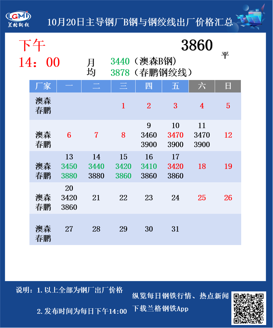 • 10月20日主导钢厂B钢与钢绞线出厂价格