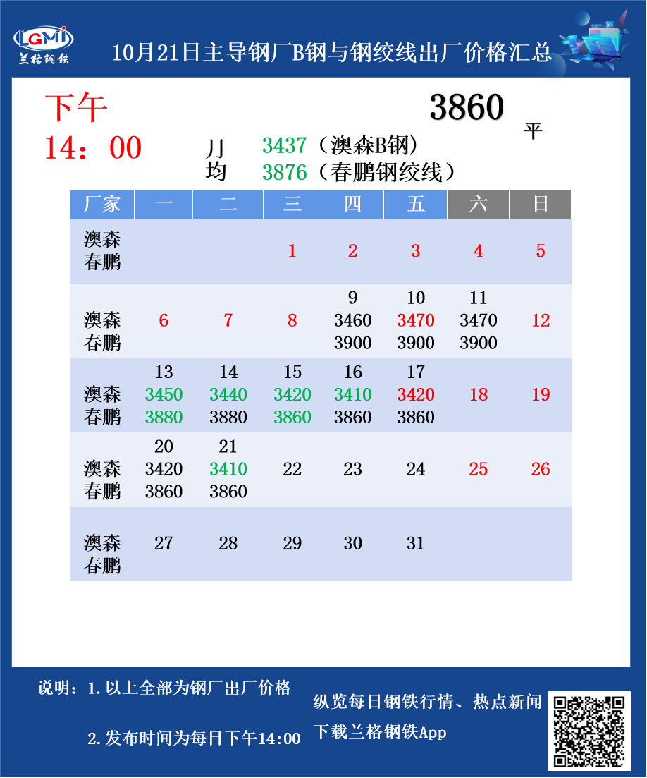 • 10月21日主导钢厂B钢与钢绞线出厂价格