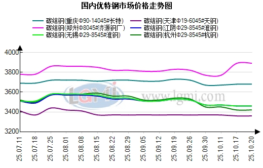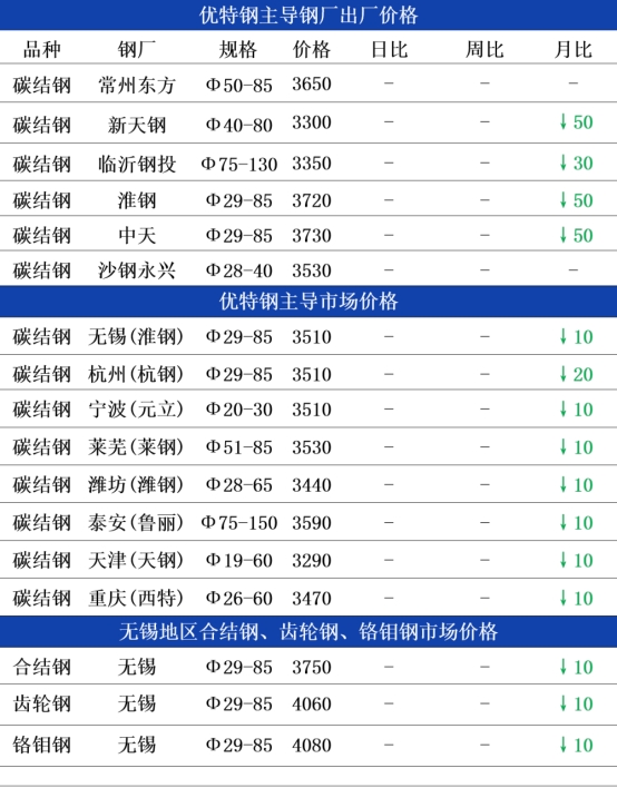 市场方面:昨日黑色系期货有上下窄幅波动,对优特钢市场情绪拉动有限,关注其后续动向,主力合约盘中或有冲击机会,或能给优特钢市场摇摆氛围带来些许转向动力。分地区来看,昨日华东地区早间从锡杭等地了解,碳合结钢资源主流报价主稳,多地明价叫卖吆喝,不过还是买卖上偏谨慎,部分规格资源有在基础上让利10-20元的直发吆喝,而轴承钢、齿轮钢资源主流维持高位坚挺,部分稀缺资源报价有10元幅度上探,流通上暂未有明显跟进的动作。华北、华中地区优特钢市场保持平稳,其中碳合结钢资源主流报价维持稳定,高端资源轴承钢、齿轮钢资源亦是企稳,场内有高位坚挺吆喝,部分期单个别有些许成交,低位买卖有起色后,优价减少,但追高后也会明显遇阻。综上,目前优特钢市场在场各方均期待新的利好消息给量价带来新的轮动起伏机会,但就目前反馈看交投一般,短时优特钢市场各方仍灵活应变,随时有调整。 钢厂方面:今日常州东方优特钢出厂价格持稳运行,现45#碳结钢出厂3650元;杭钢优特钢日定价圆钢价格持稳运行,现45#碳结钢出厂3510元,以上均为含税价格;临沂钢投优特钢出厂格持稳运行,现45#碳结钢出厂3360元;天钢优特钢出厂价格持稳运行,现45#碳结钢出厂3300元。目前早盘日定价优特钢钢企多持稳,虽近日午后不时有10-20元左右的调整报价,但实际多有优惠搭配,报价都显得不算强势,钢企端情绪仍多谨慎。