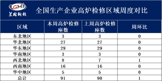 二、全国生产企业高炉检修区域对比 据兰格调研:201家样本高炉企业中,有91座高炉检修,较上周增加1座。其中:东北地区3座高炉检修,较上周持平;华北地区27座高炉检修,较上周持平;华东地区29座高炉检修,较上周持平;华南地区3座高炉检修,较上周持平;西北地区8座高炉检修,较上周增加1座;西南地区16座高炉检修,较上周持平;华中地区5座高炉检修,较上周持平。