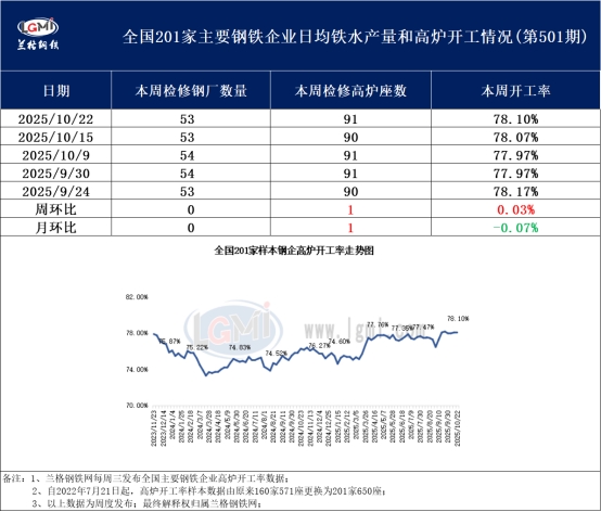 一、全国201家生产企业高炉开工周度数据上升 据兰格钢铁网监测数据显示,2025年10月22日全国201家生产企业中有53家钢厂共计91座高炉检修停产,总容积为97590立方米,较上周减少390立方米,按容积计算主要钢铁企业高炉开工率为78.1%,较上周上升0.03%。 本周铁水总量较上周小幅增加,增量集中在西北区域,主要是域内1座前期停产检修大高炉恢复生产,使得铁水总量有所增加;而华北及华东区域受新增1座小高炉检修停产及1家企业减产影响,铁水总量较上周有所减少;其他区域铁水总量则较上周暂无变动。