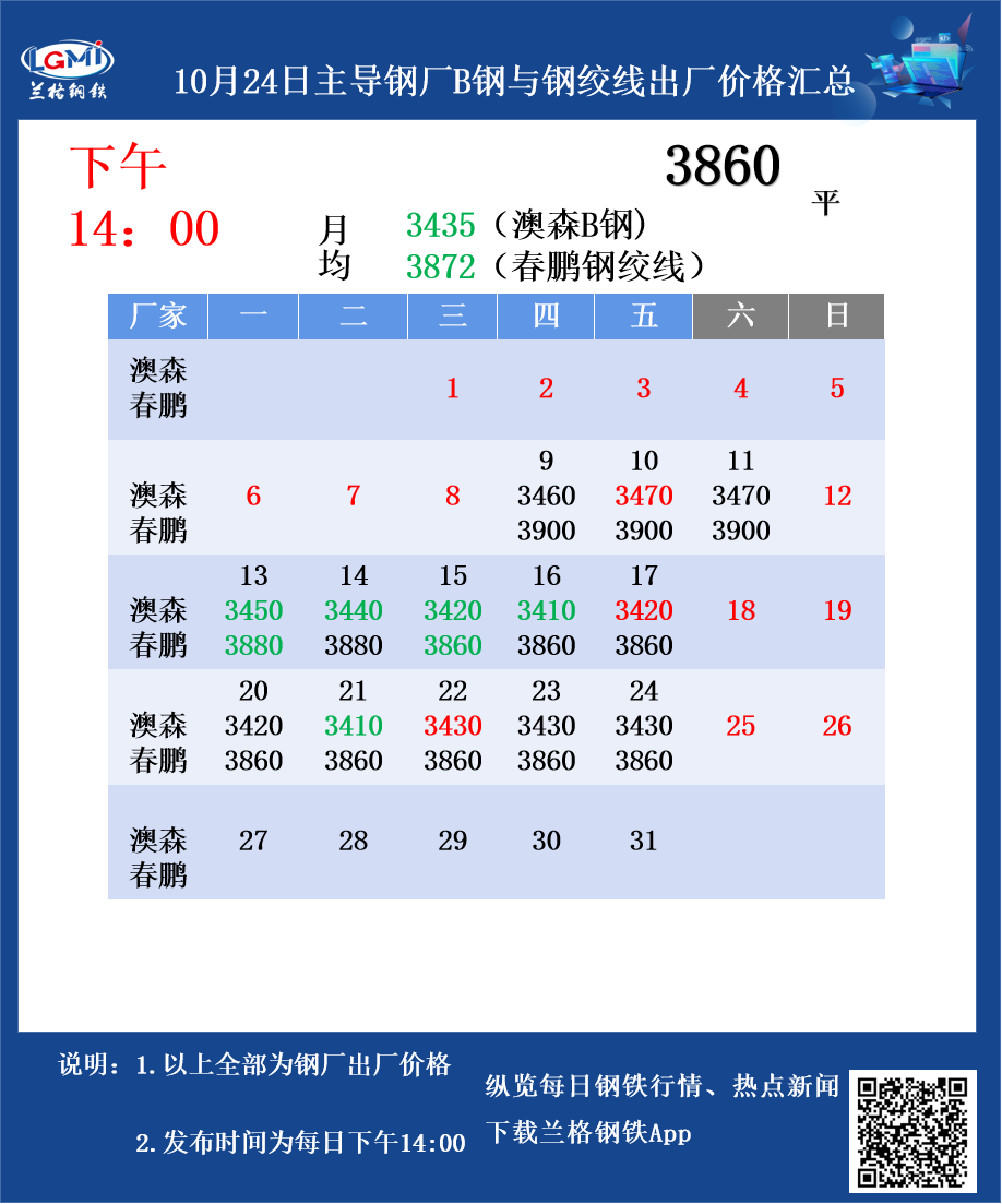 • 10月24日主导钢厂B钢与钢绞线出厂价格