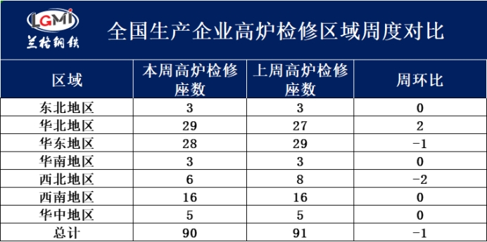 二、全国生产企业高炉检修区域对比 据兰格调研:201家样本高炉企业中,有90座高炉检修,较上周减少1座。其中:东北地区3座高炉检修,较上周持平;华北地区29座高炉检修,较上周增加2座;华东地区28座高炉检修,较上周减少1座;华南地区3座高炉检修,较上周持平;西北地区6座高炉检修,较上周减少2座;西南地区16座高炉检修,较上周持平;华中地区5座高炉检修,较上周持平。