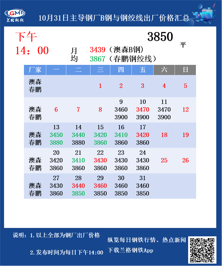 • 10月31日主导钢厂B钢与钢绞线出厂价格