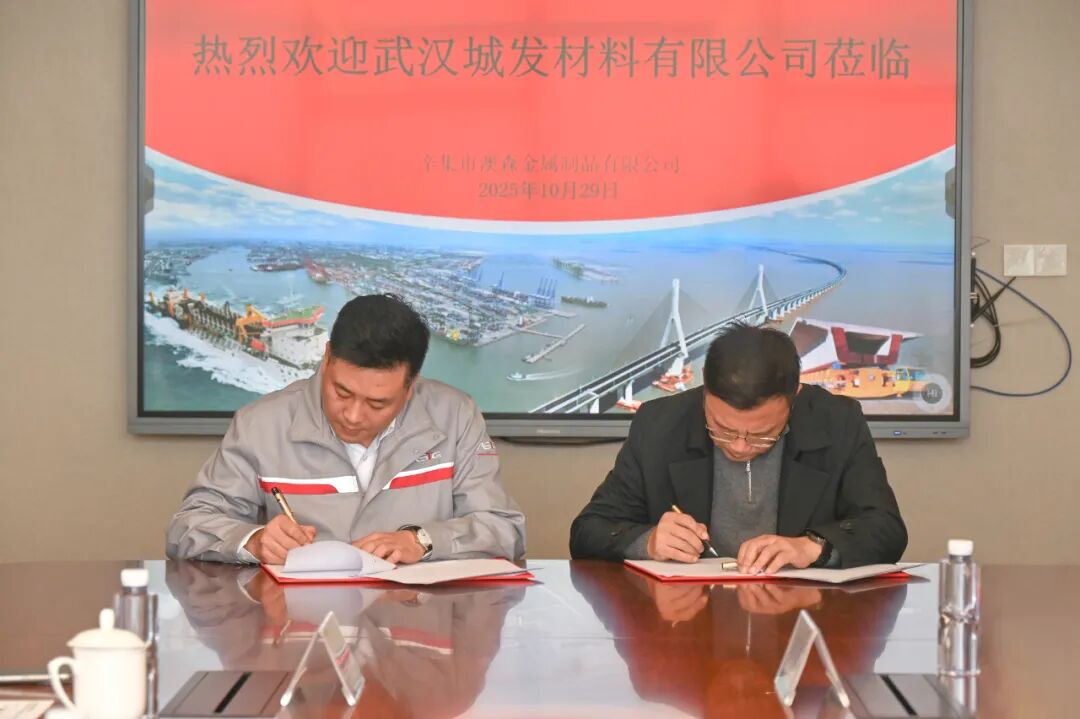 10月29日,武汉城发材料有限公司(以下简称“武汉城发”)与澳森特钢正式签署战略合作框架协议。双方一致同意建立长期稳定的合作关系,携手推动区域建筑业实现更高质量的发展。武汉城发材料公司副总经理张辉、胡永胜,澳森特钢非钢销售总监刘伟出席签约仪式并讲话。