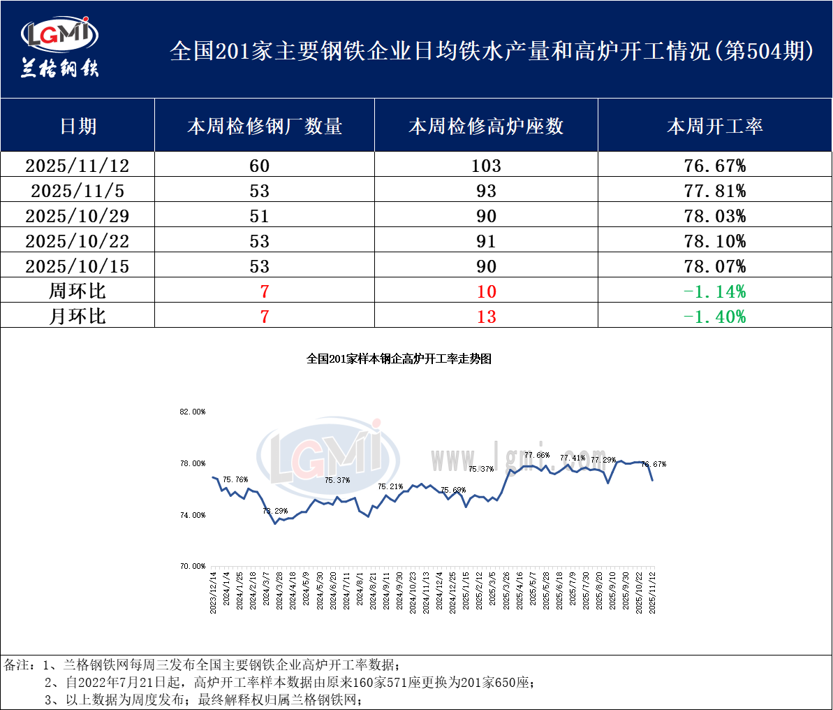 一、全国201家生产企业高炉开工周度数据下降 据兰格钢铁网监测数据显示,2025年11月12日全国201家生产企业中有60家钢厂共计103座高炉检修停产,总容积为113710立方米,较上周增加12950立方米,按容积计算主要钢铁企业高炉开工率为76.67%,较上周下降1.14%。 本周铁水总量较上周有所减少,主要在于东北、华北、西北区域,由于天气转冷,冬季高炉消耗较大,部分钢企提前安排检修,在东北区域表现明显,随着停产高炉增多,整体铁水产量大幅下降,成品材后期供应或将有所减量,至于南部区域,基本高炉生产处于正常水平,无明显检修计划,铁水供应持续。