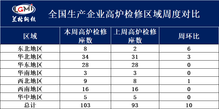 二、全国生产企业高炉检修区域对比 据兰格调研:201家样本高炉企业中,有104座高炉检修,较上周增加10座。其中:东北地区8座高炉检修,较上周增加6座;华北地区34座高炉检修,较上周增加3座;华东地区28座高炉检修,较上周持平;华南地区3座高炉检修,较上周持平;西北地区9座高炉检修,较上周增加1座;西南地区16座高炉检修,较上周持平;华中地区5座高炉检修,较上周持平。